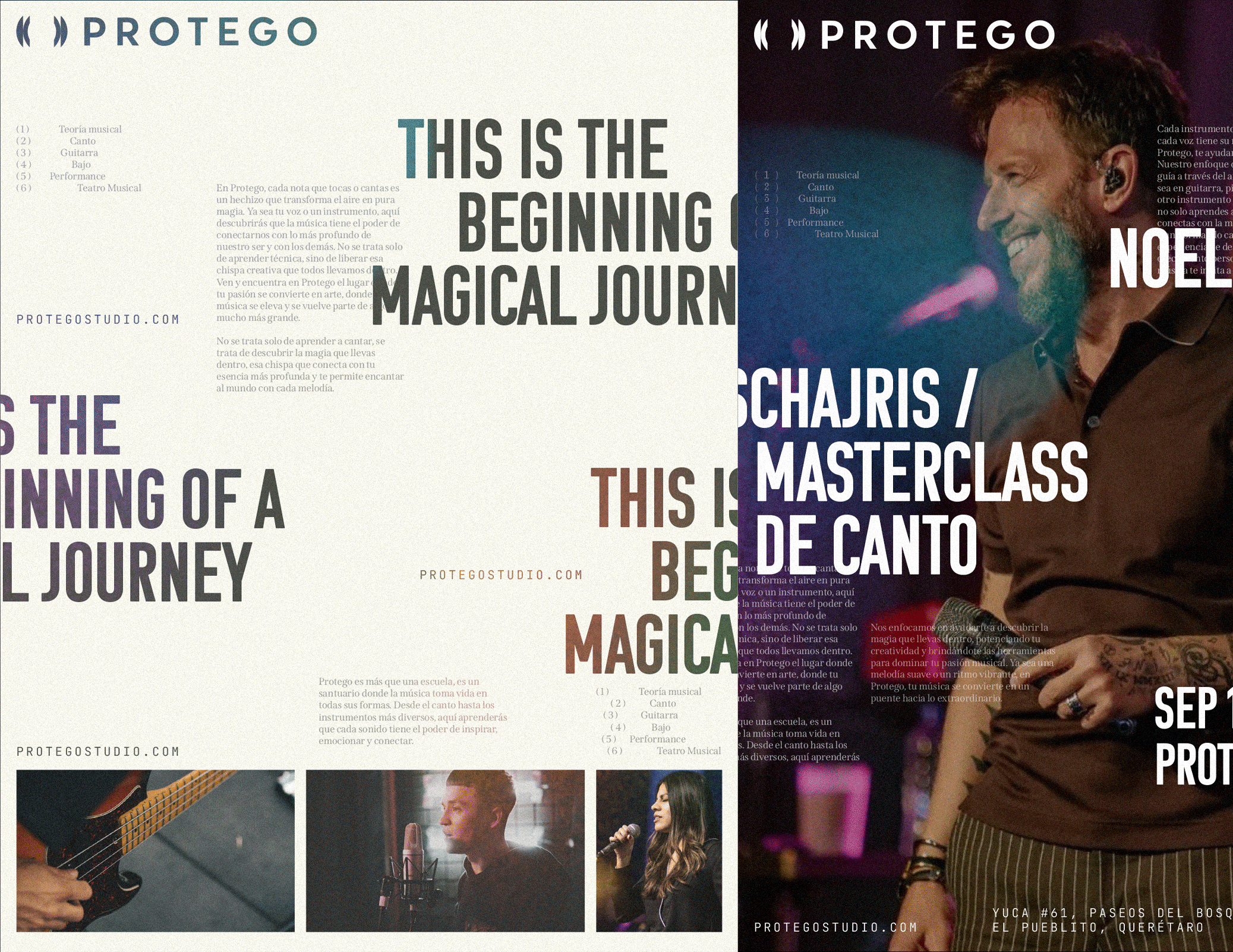 Protego es una academia de música donde el sonido se encuentra con la magia. La identidad se construye a partir de la esencia física del sonido: vibración, frecuencia, energía y su forma de propagarse como un hechizo en movimiento.