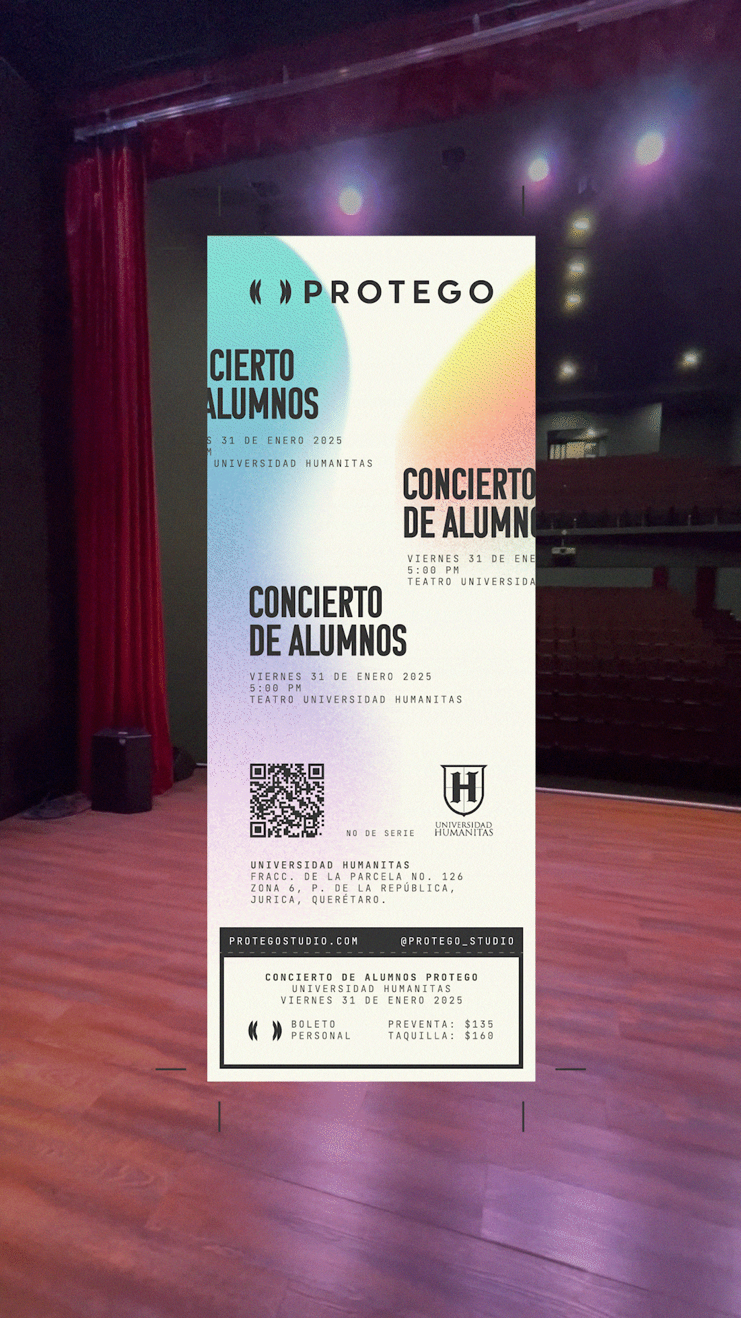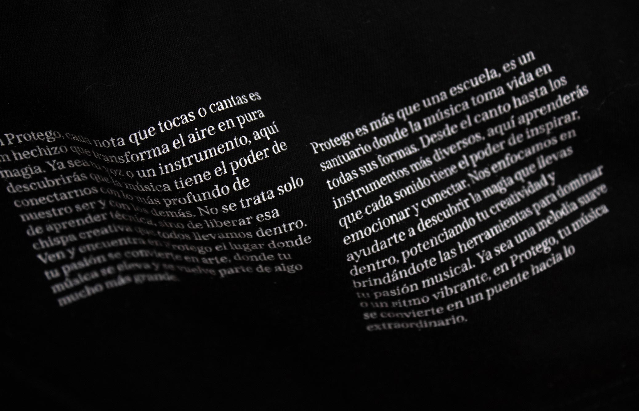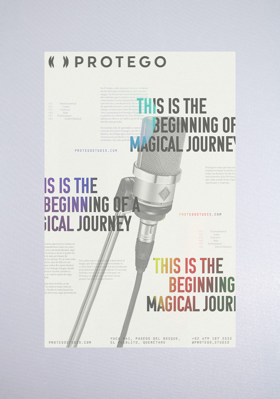 Los degradados de color evocan la iluminación escénica y el espectáculo, equilibrando conocimiento con diversión, disciplina con asombro. Protego es el lugar donde la música se vive como algo verdaderamente mágico.